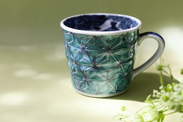 緑が鮮やかなマグカップです。紋様は麻の葉をイメージしています。内側には染付で山水を描いています。もちろん手描き手作りで磁器焼成です。実際に持っていただくと驚くほど軽いです。たっぷりと朝のモーニングカフェオーレやたっぷりとティーをお召し上がりください。 手描き、手作り。村田幸之助窯 口径9.5 x 高8cm