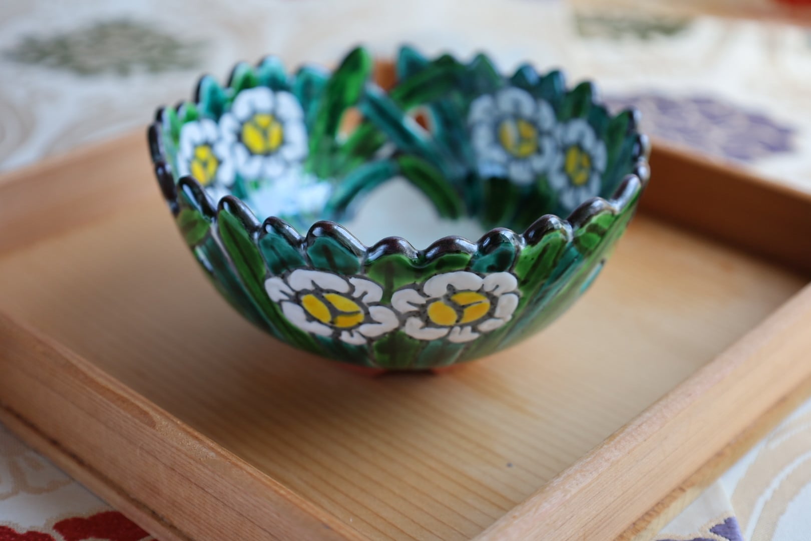 乾山写の水仙をあしらった向付です。水仙の花の部分、葉の部分を丁寧に彫って色付けされています。透かしといって葉と葉の間が空いているのが特徴でそこから向こうの景色も見えとても立体的に一つの衣装として味わっていただけます。お刺身、炊き合わせを盛るのもよし、お菓子やデザートもとてもすてきに演出してくれます。
