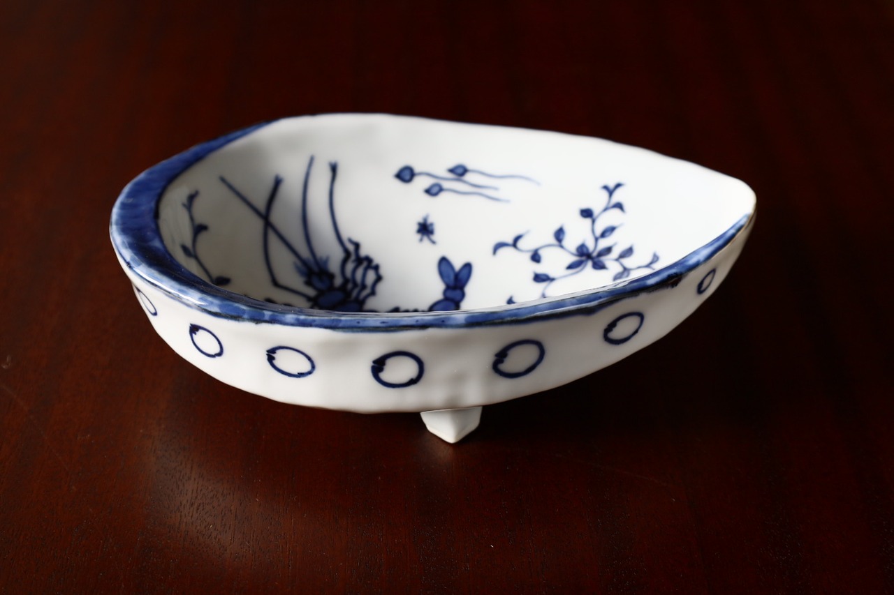 形は鮑の形になっていて、裏は三つ足です。お造り、お刺身からお惣菜まで幅広く