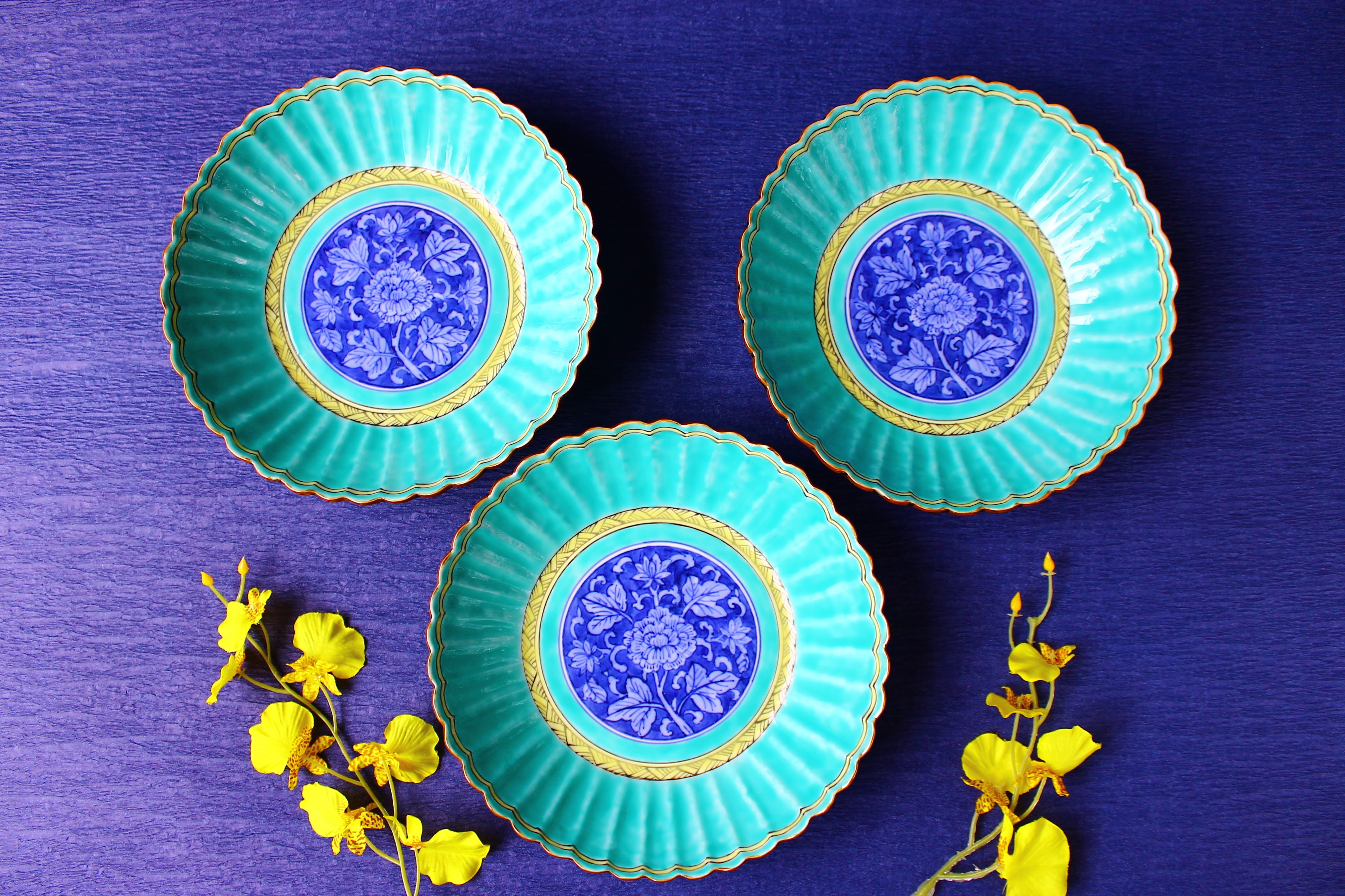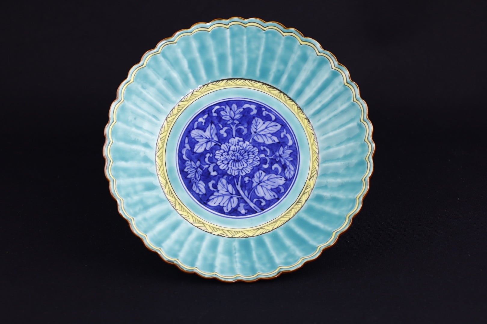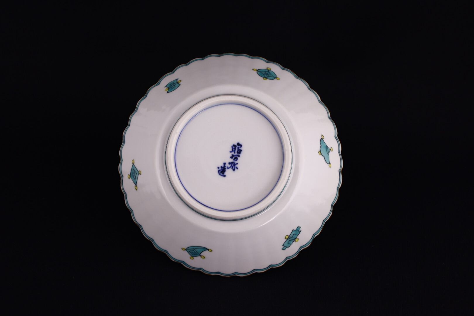 菊弁といって細かいそぎに緑が鮮やかな鉢です。見込には染付で花唐草がポイントです。