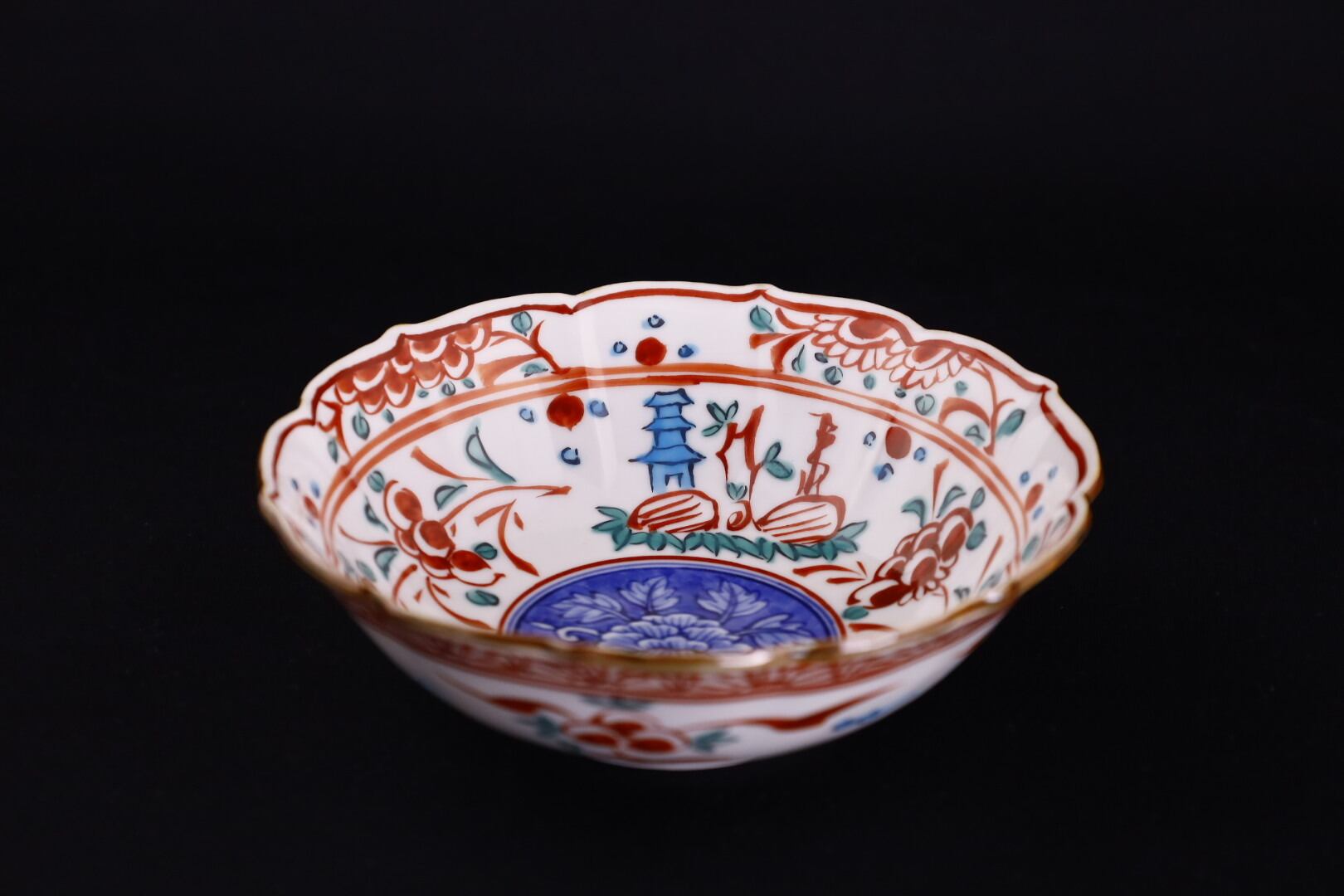 鮮やかな赤絵の花唐草、山水を描いて、見込に花紋をつけた鉢です。