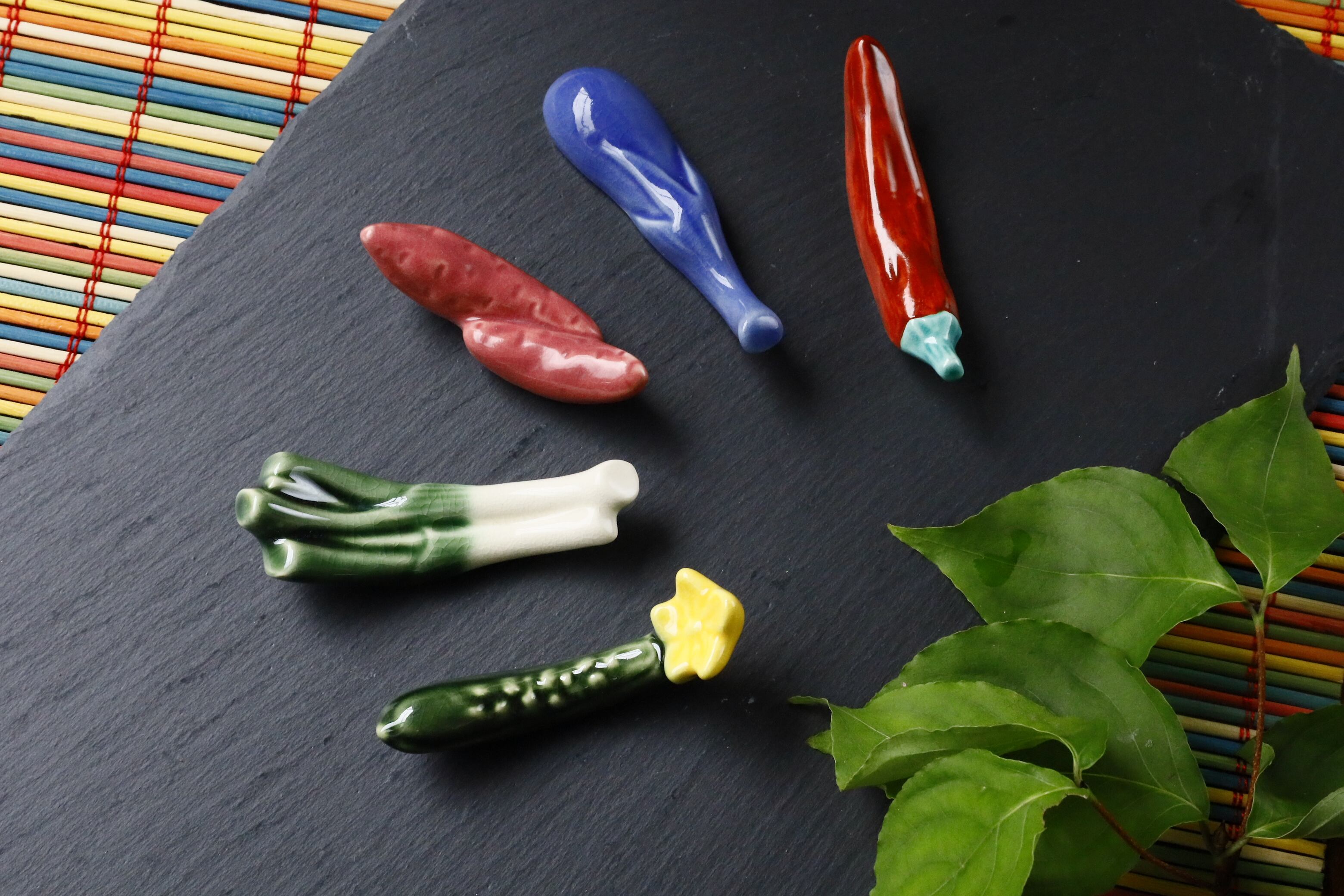 陶器でできた野菜の形の箸置です。色絵も手描きですので丁寧に濃淡をつけて出来上がっています。