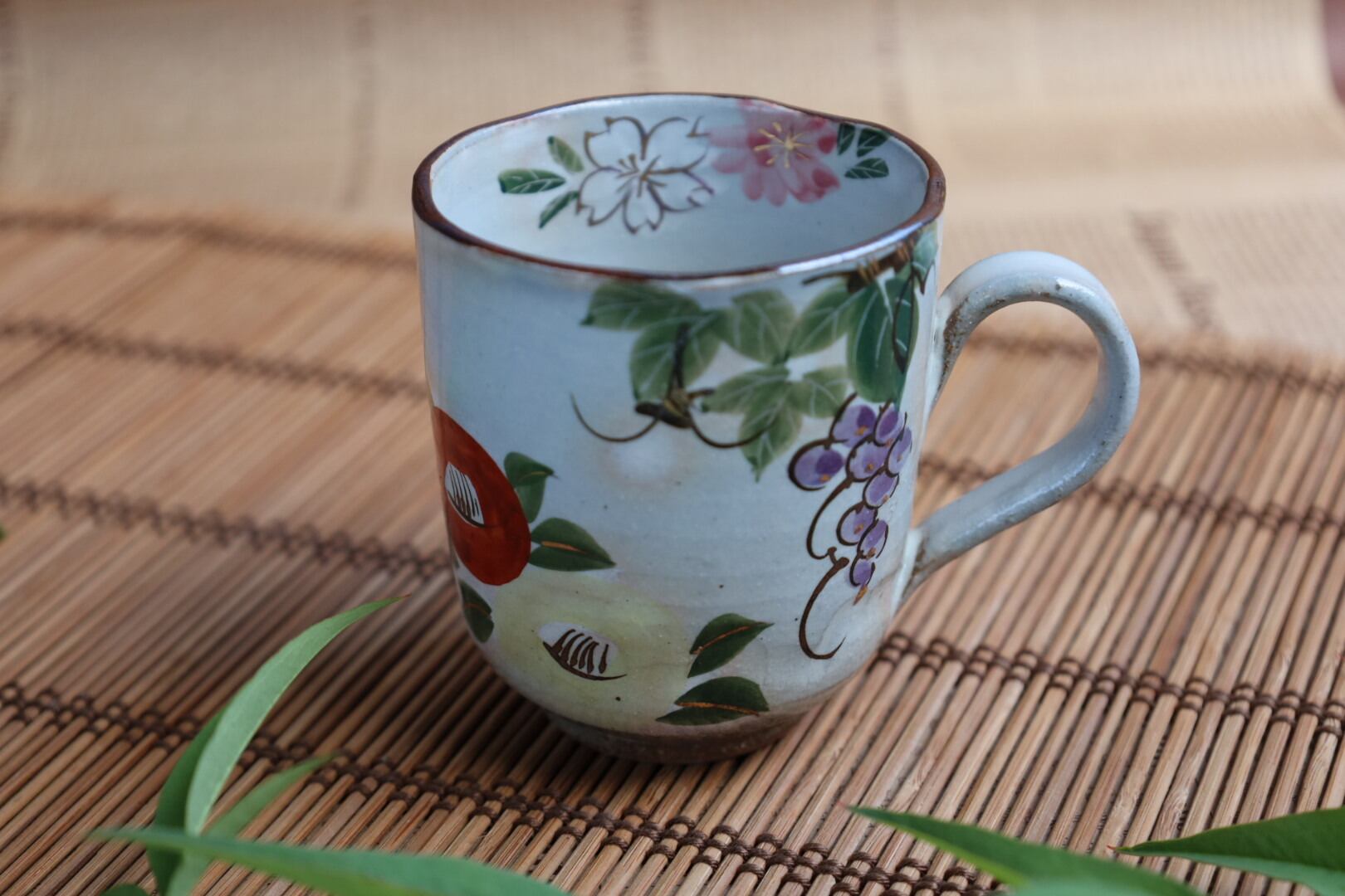 内側に桜花、側面に葡萄、椿を丁寧に描いて一年中楽しめてお使いいただけます