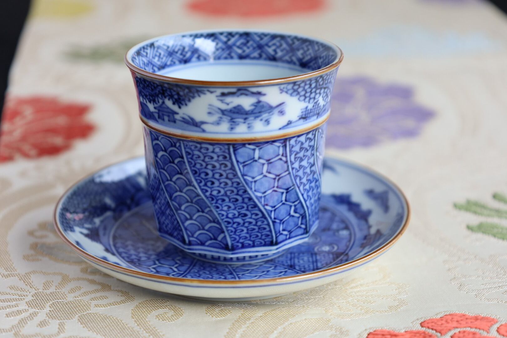 湯呑の胴回りに捻祥瑞縁に山水紋様を描き お皿も合わせて捻祥瑞と山水紋様を描いています