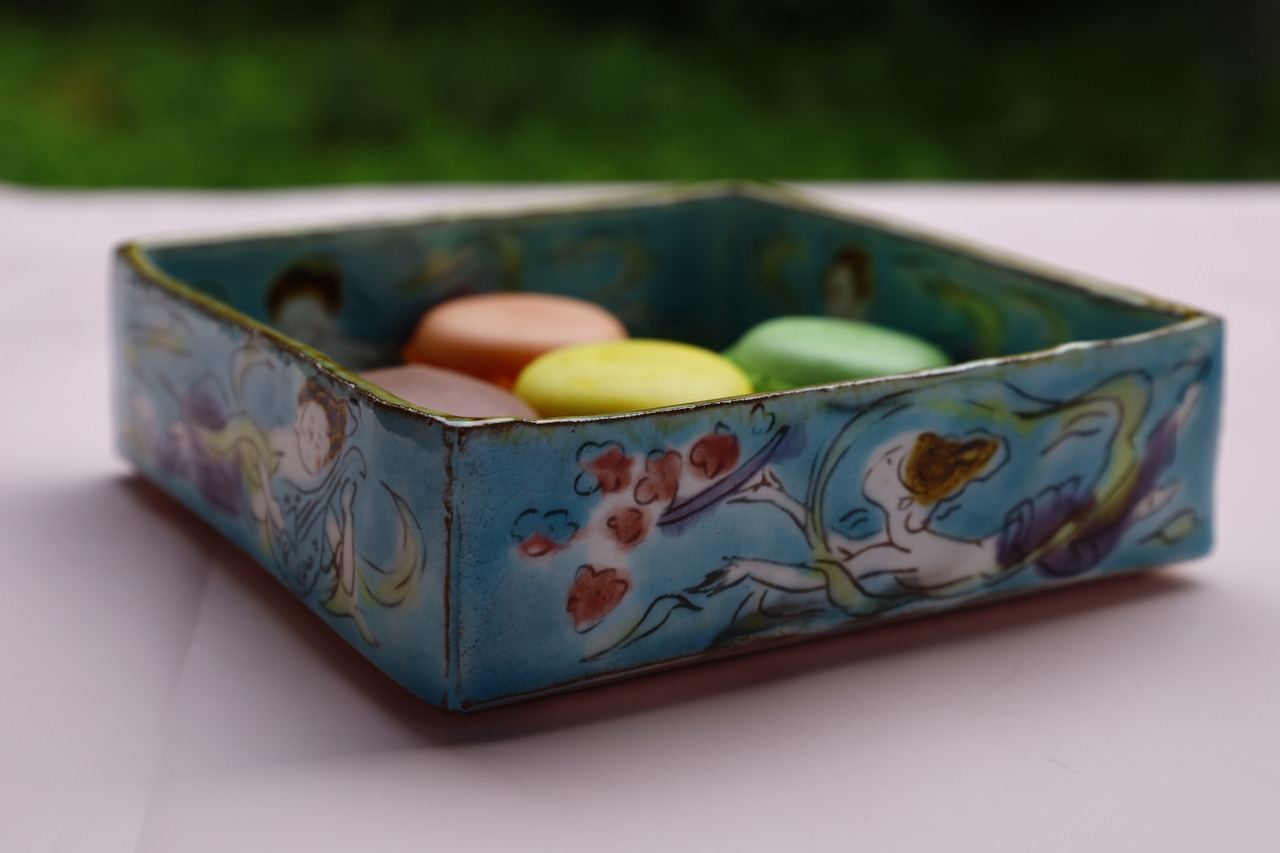 青釉をベースに釉彩で絵柄を書き込んだ四方箱皿です
