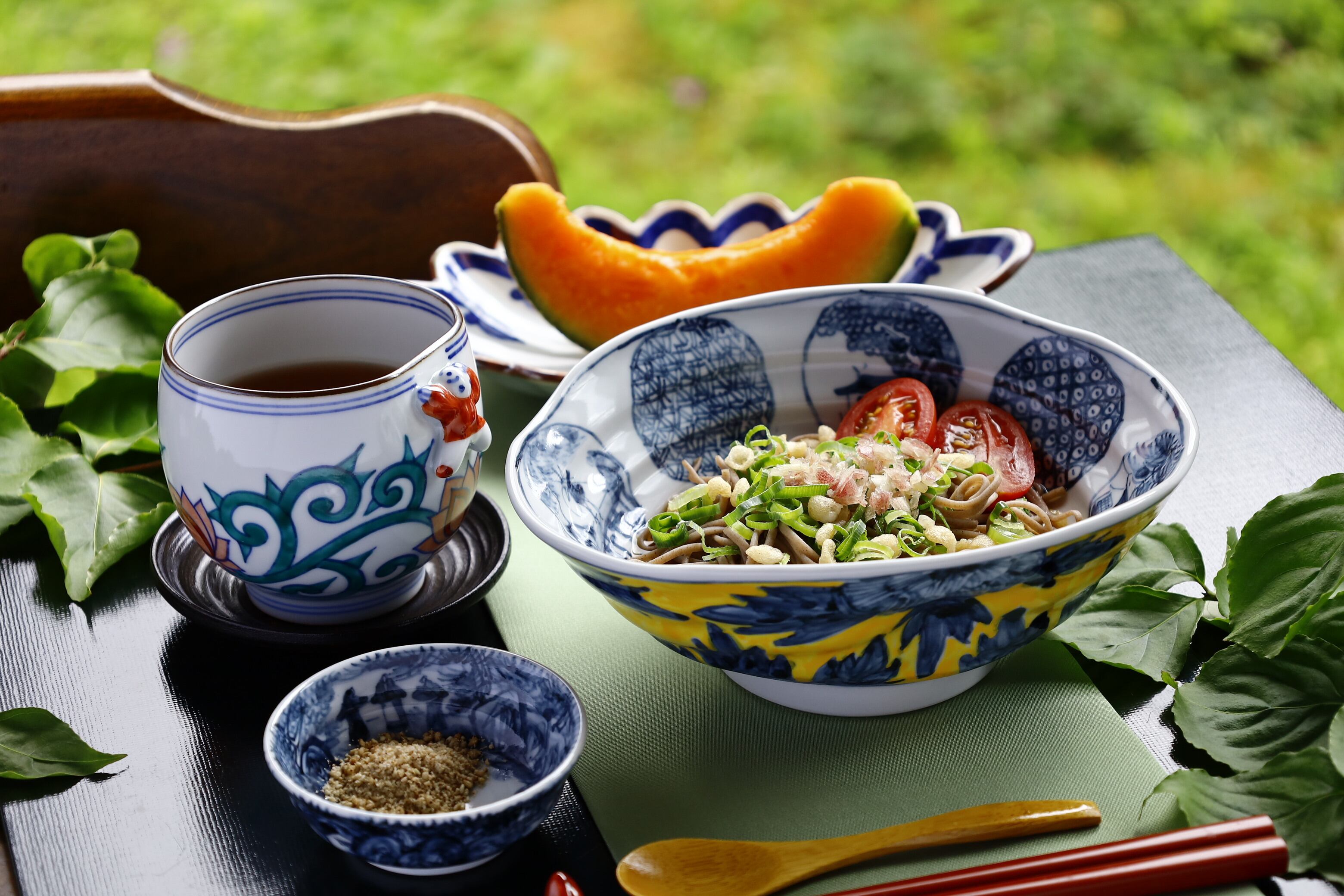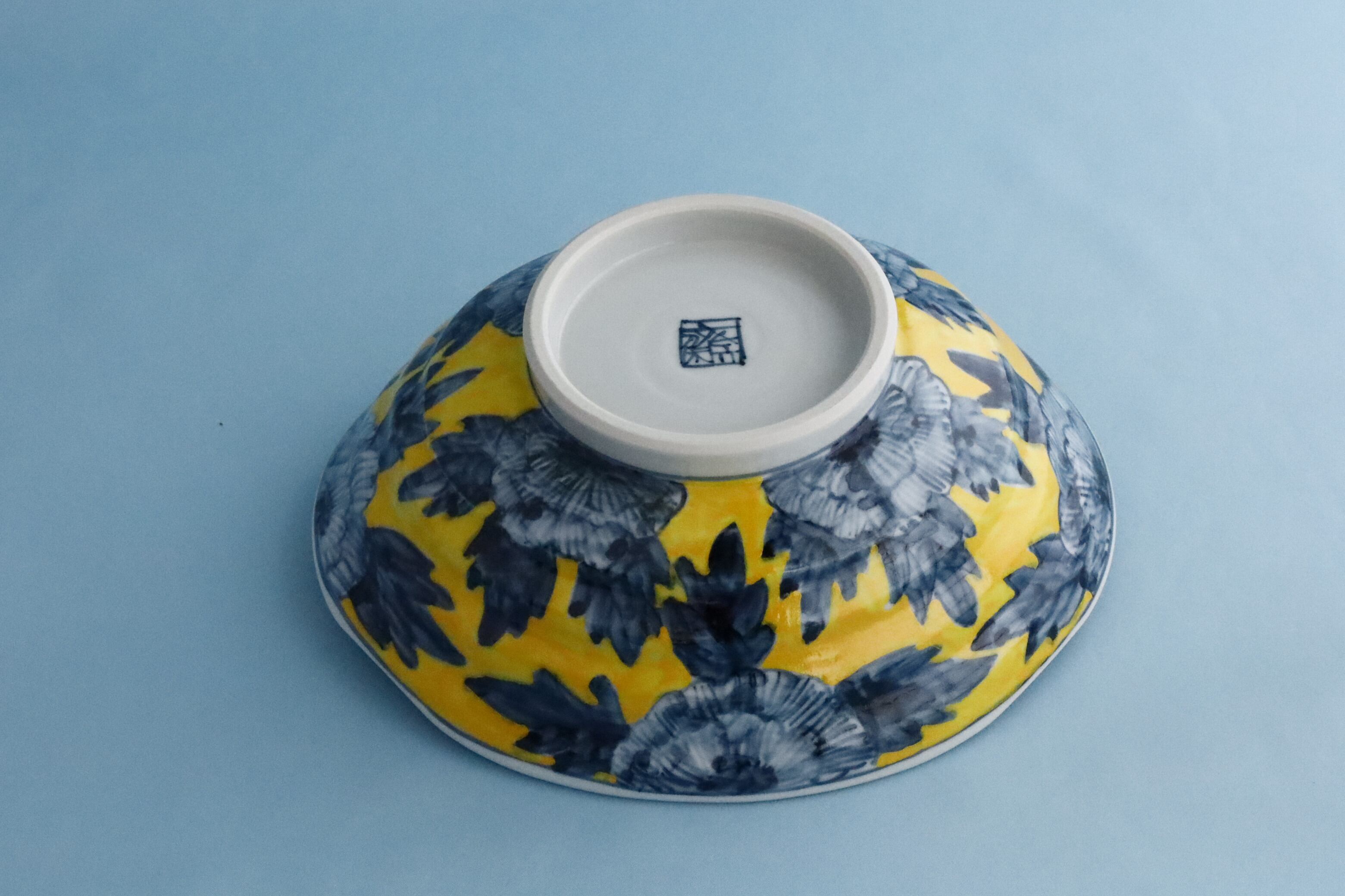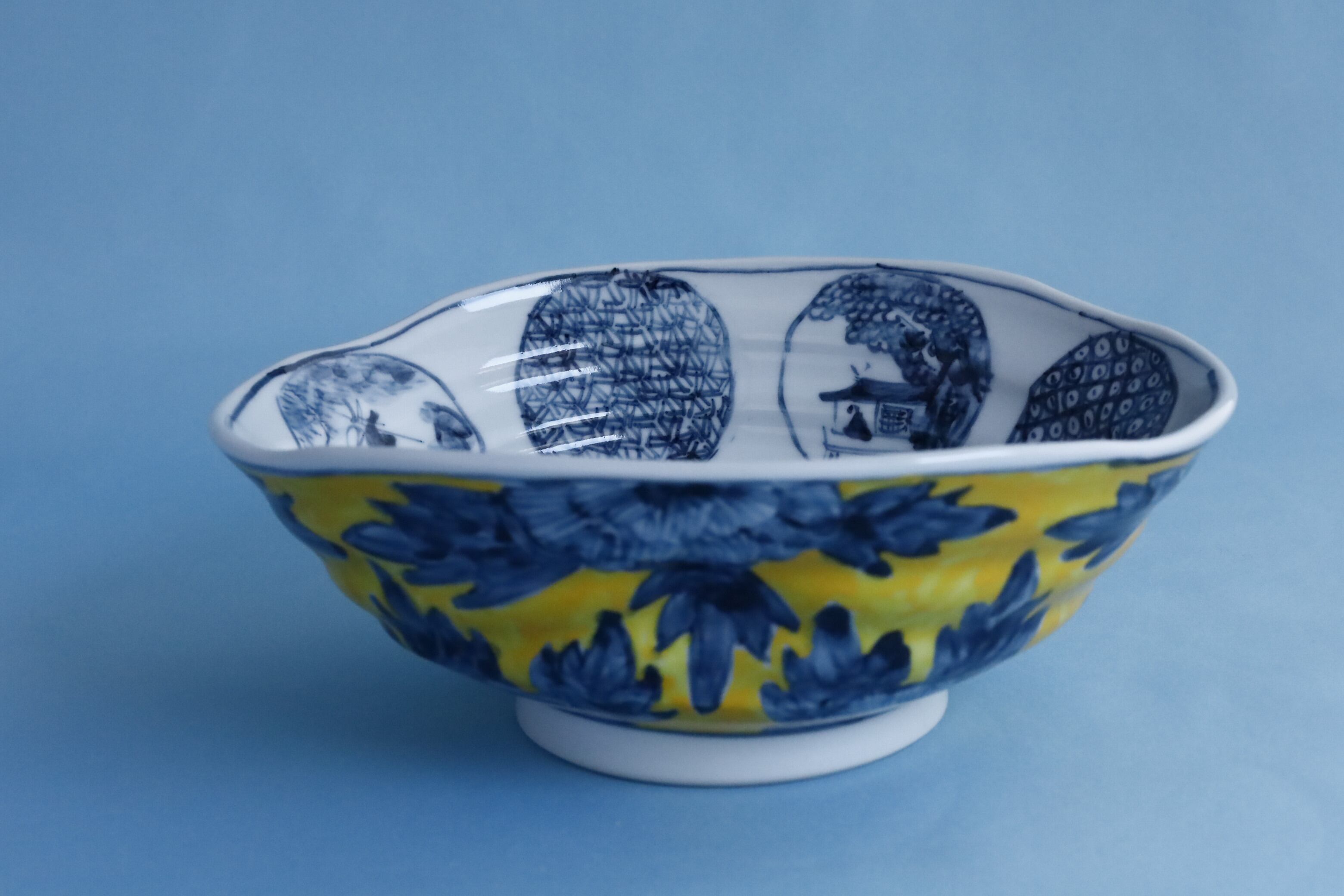 内側には丸紋の中に染付で山水画や小紋様を描き、外には草花を描き、余白を黄だみで整えています とてもおしゃれな器でお惣菜によくお似合いです