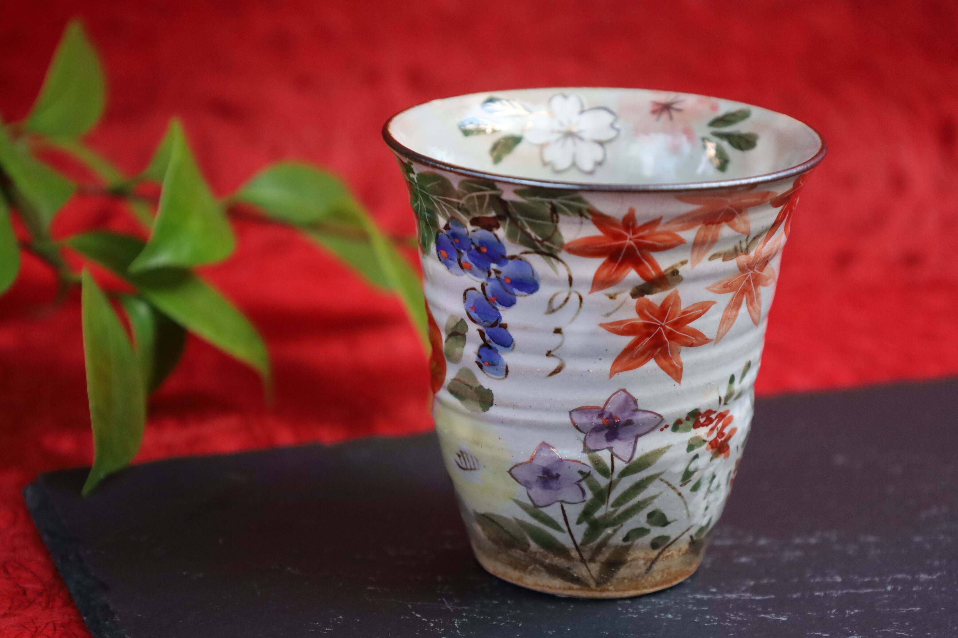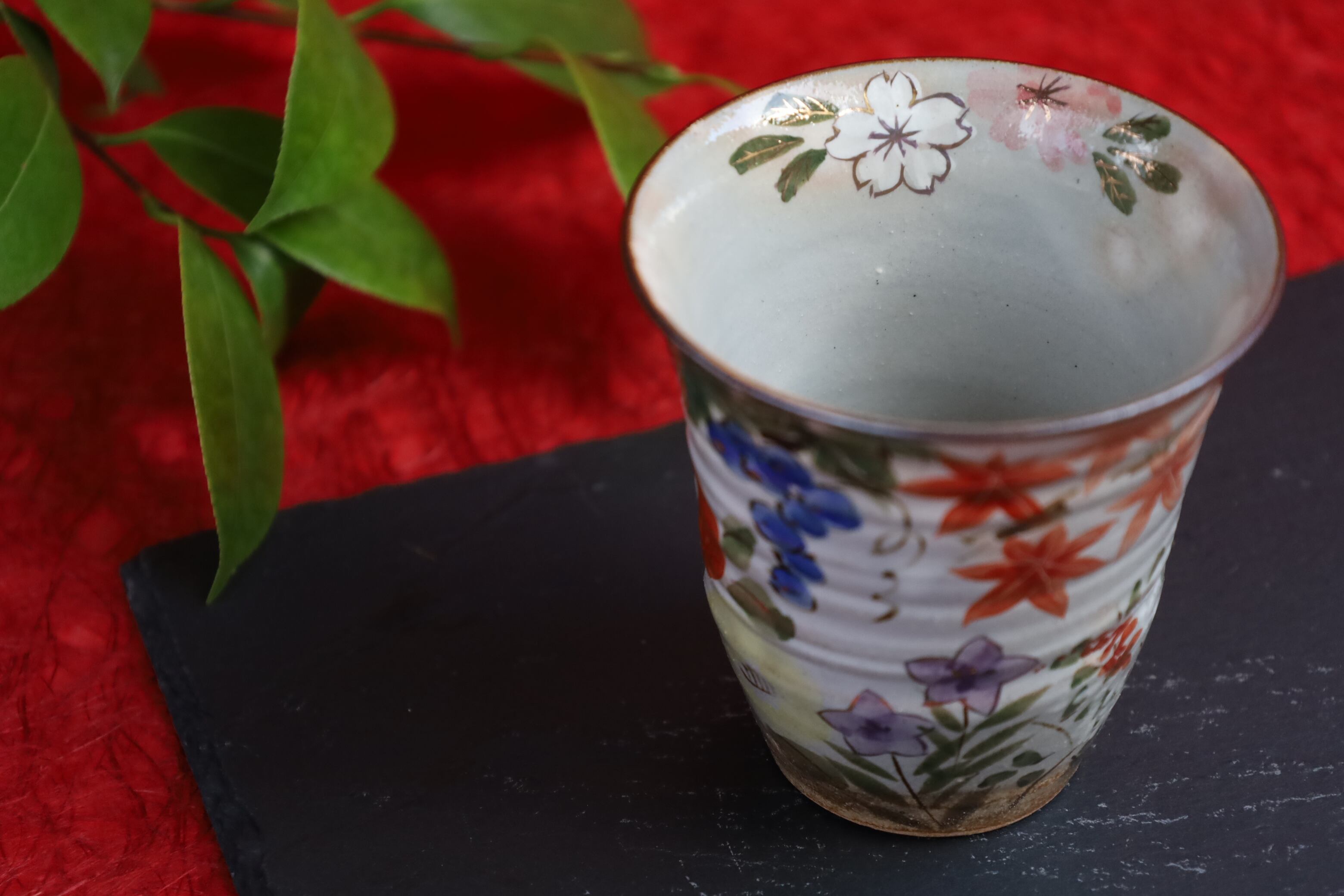 御本手といってほんのり赤く窯変によって現れた土味に色絵で鮮やかに上絵付けを手書きでほどこしています 絵柄は桜、もみじ、桔梗、萩、葡萄、椿と四季よりどりの四季草花の絵柄です 一年中お楽しみいただけます 胴にはろくろ手の筋があり、手に馴染み持ちやすくなっています フリーカップとして たっぷりのお茶や、アイスコーヒー、モーニングティーなどお好みに応じてお楽しみ下さい