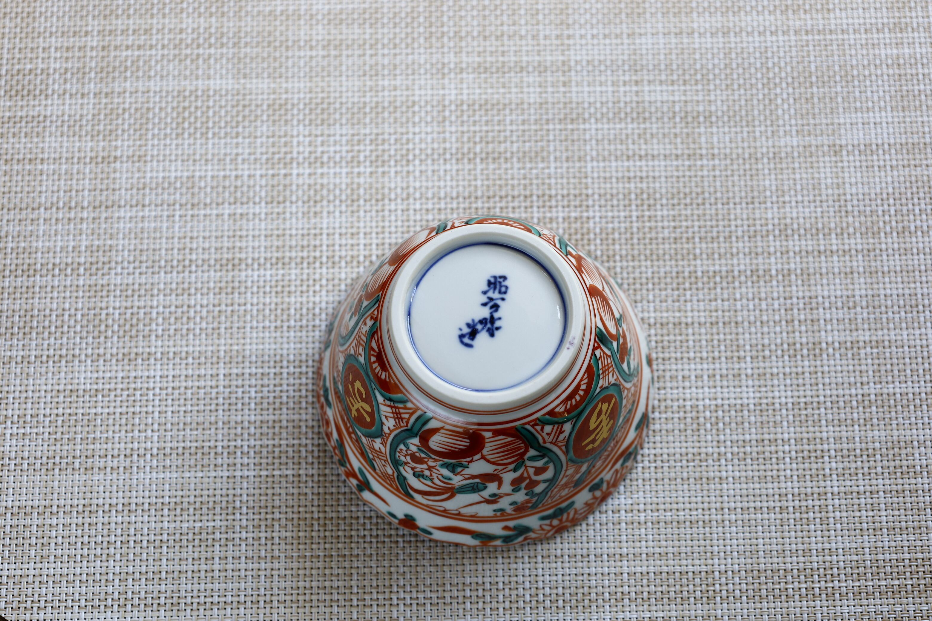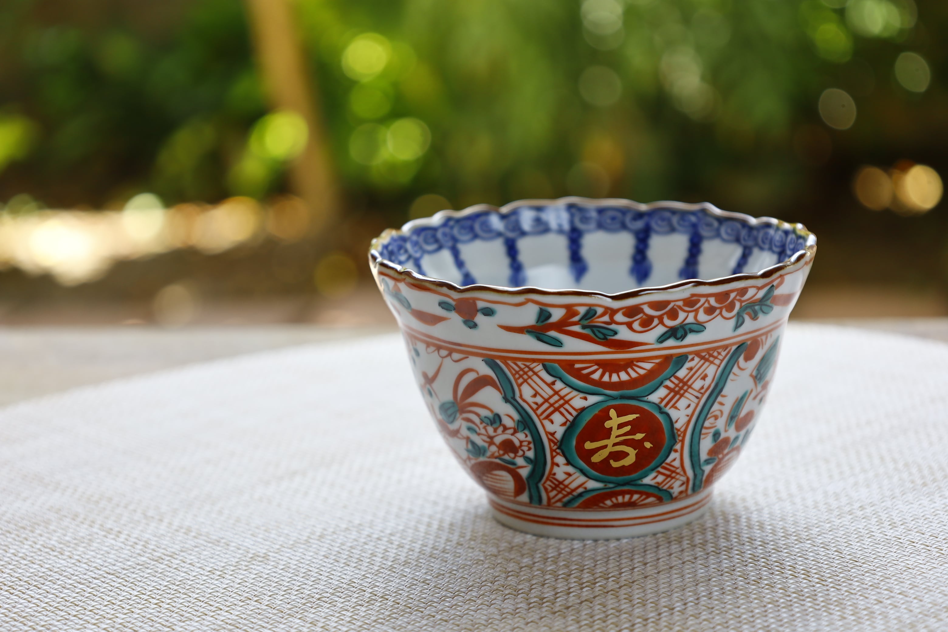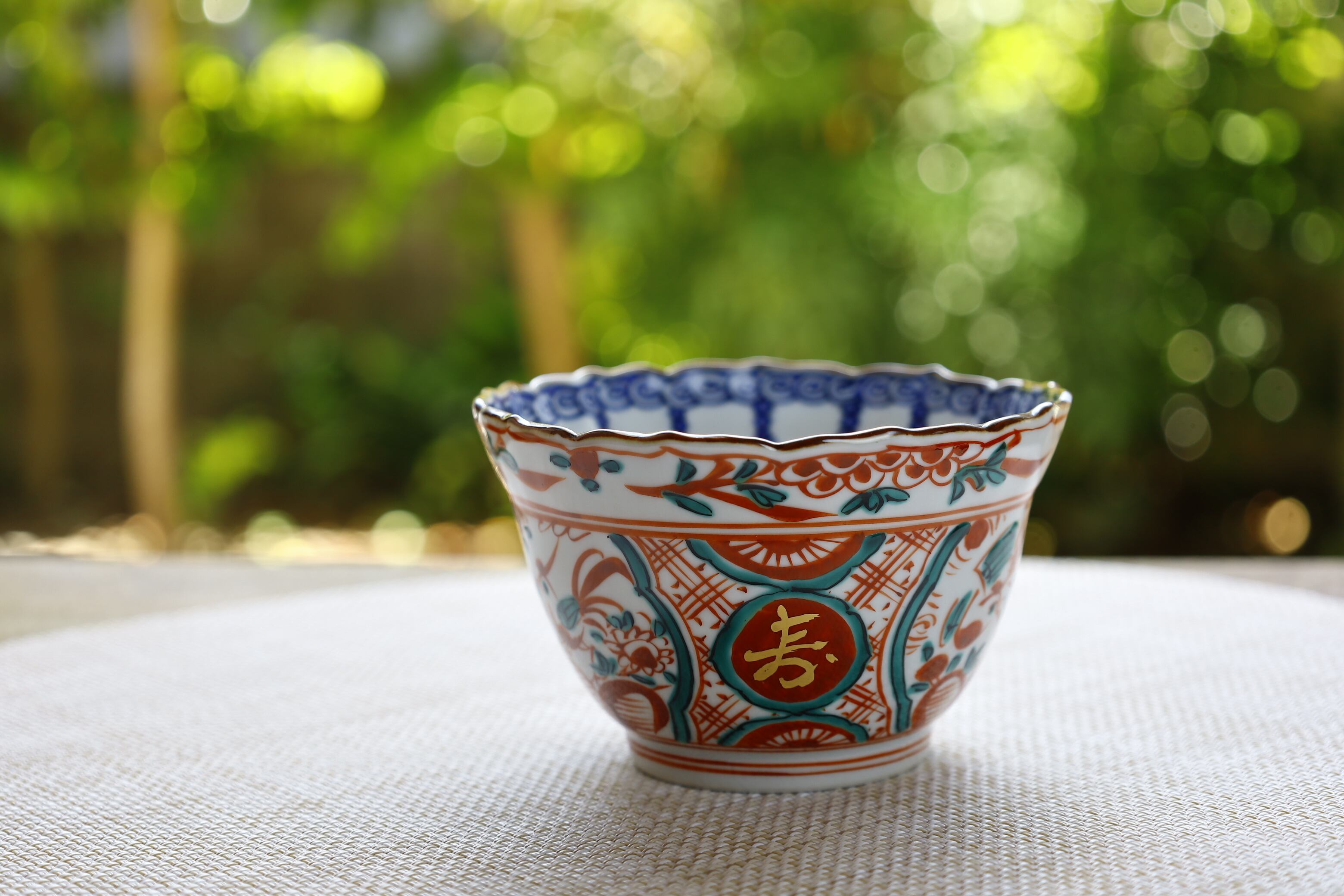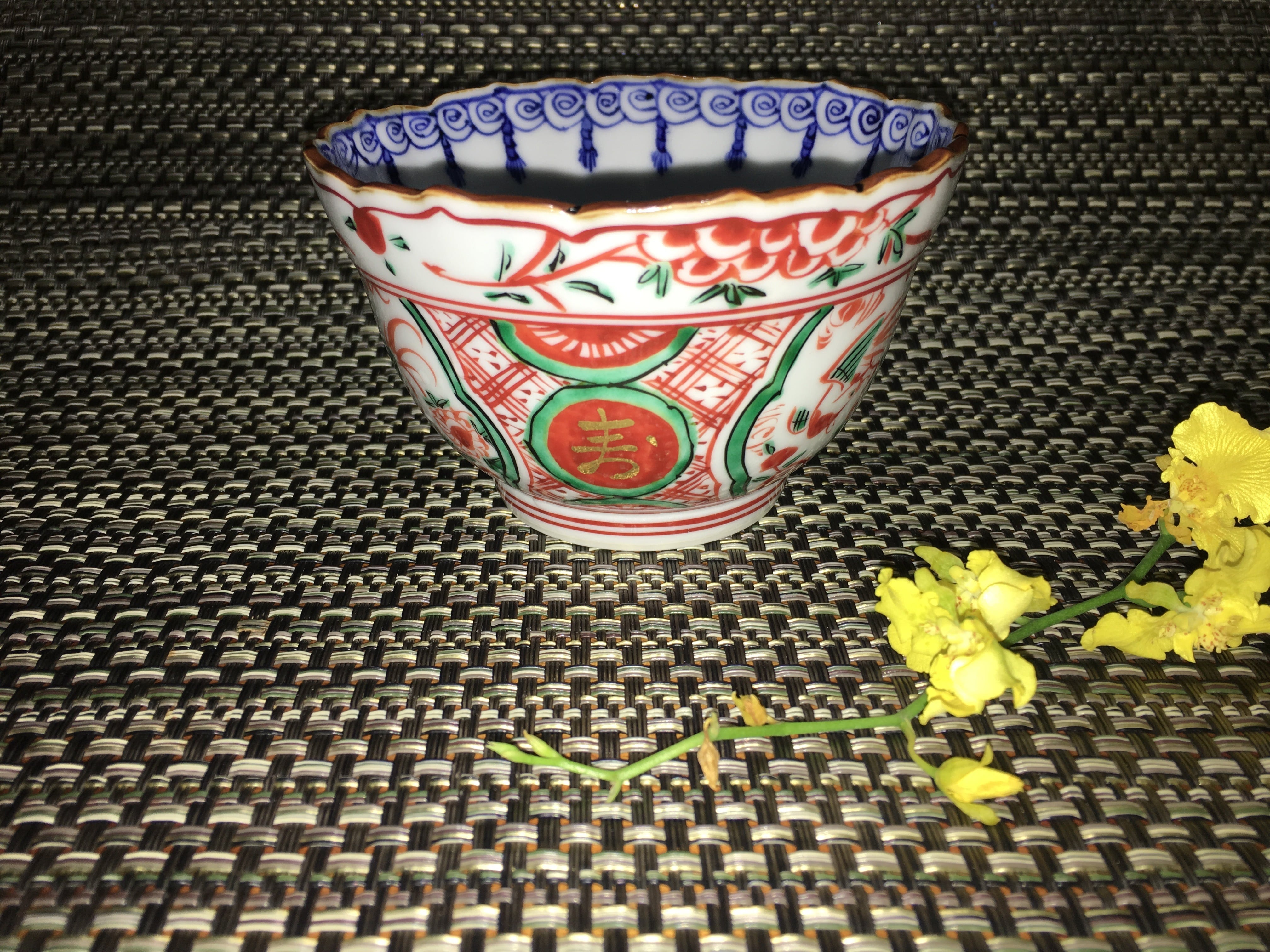 縁取りが輪花になった 内側に染付で瓔珞紋様を描き 外は赤絵で小紋様 そして金彩で寿をあしらっています