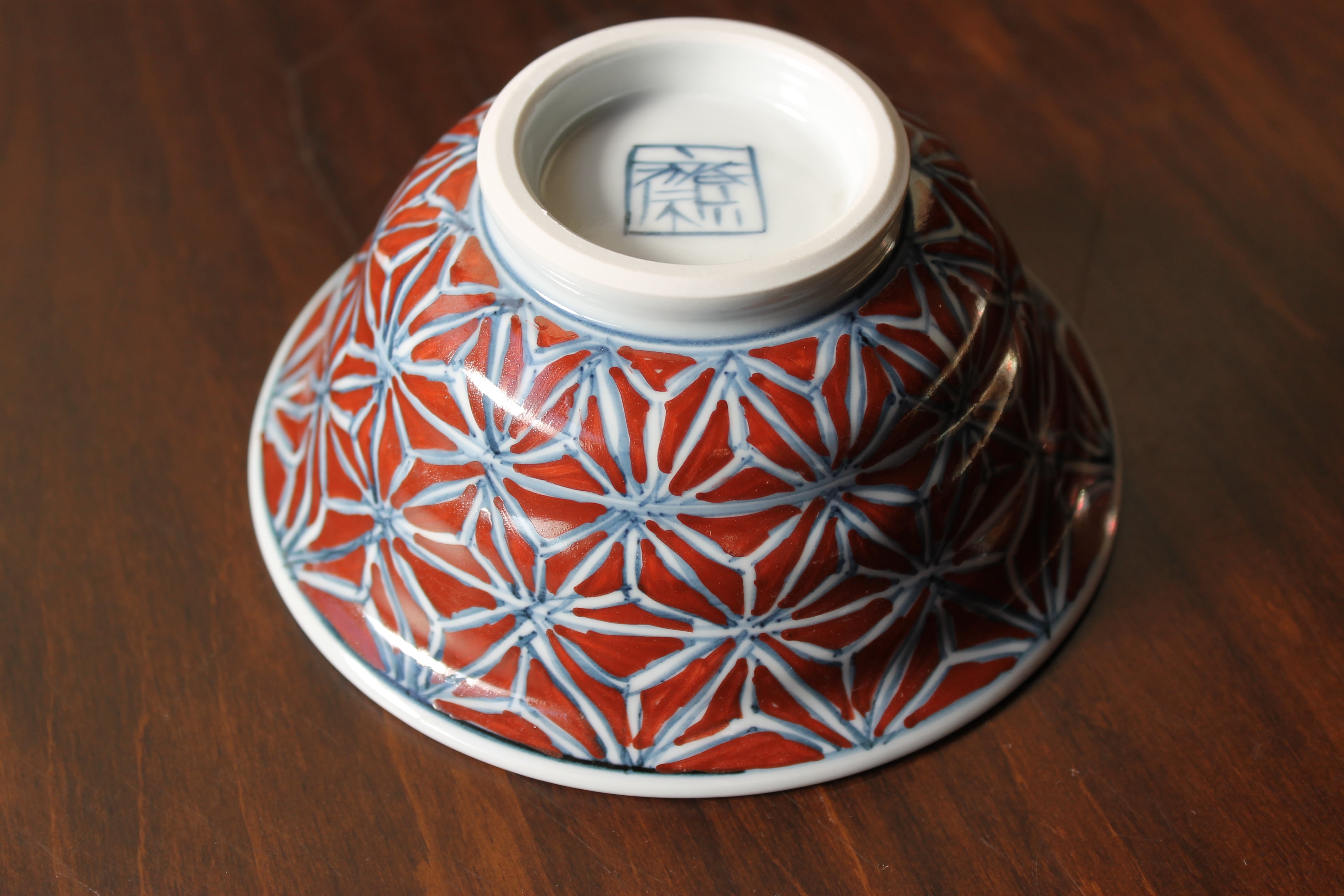 赤絵で麻の葉の紋様を描いたご飯茶碗です,内側は染付で山水紋様を描いています