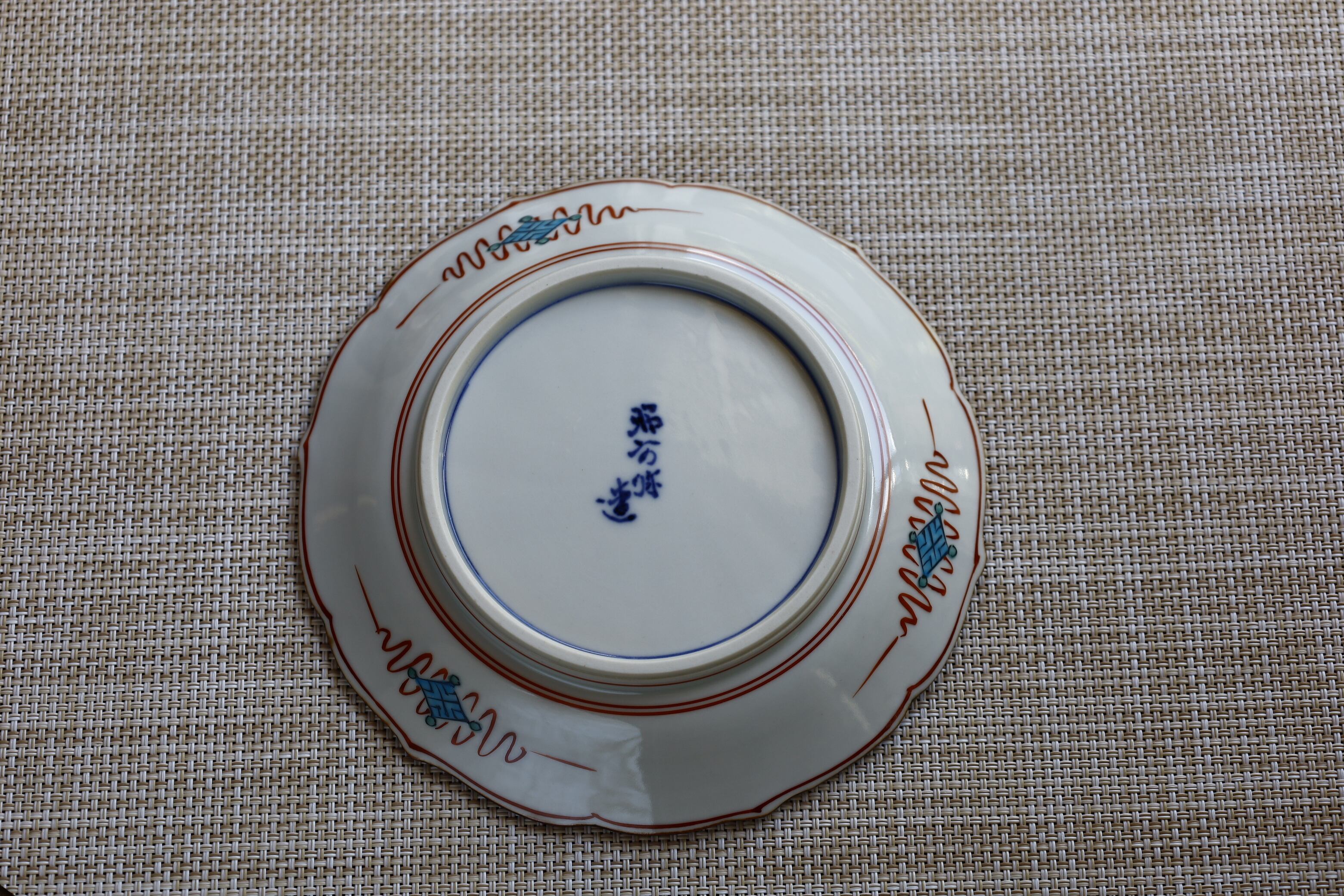 鮮やかな赤絵の花唐草、山水を描いて、見込に花紋をつけた15cm径のお皿です。